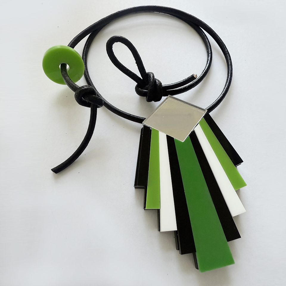 Collana in plexiglass con girocollo in pelle passante. Ispirazione Artdecò