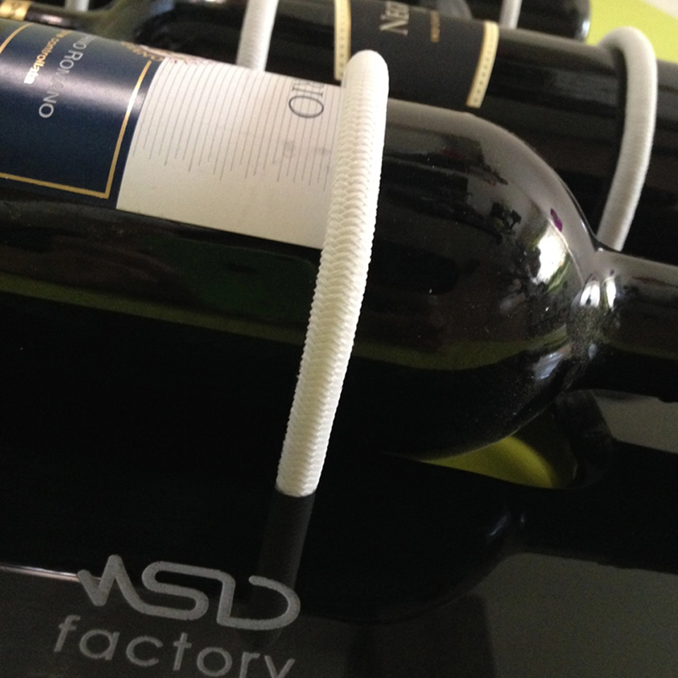 Espositore per bottiglie di vino realizzato in plexiglass, spessore 10mm e corde elastiche in nylon di derivazione nautica.