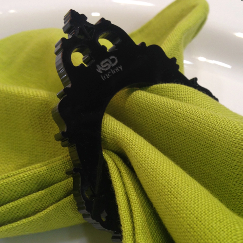 Elegante Kit di n°6 fermatovaglioli in plexiglass con motivo barocco.