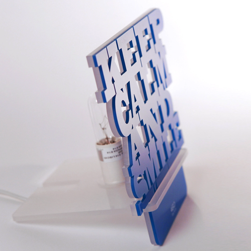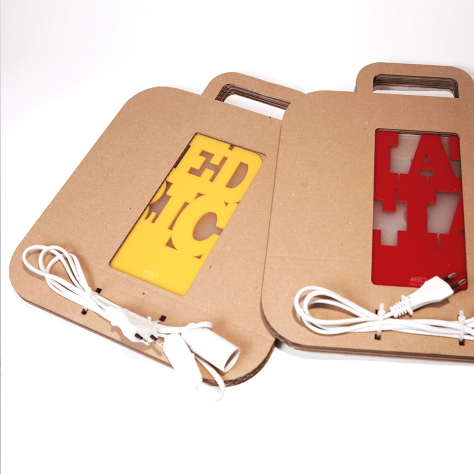 Lampada composta da 3 elementi in plexiglass, assemblabili tramite un semplice schema ad incastro. La parte frontale è colorata ed è personalizzabile con un nome o una frase a scelta.