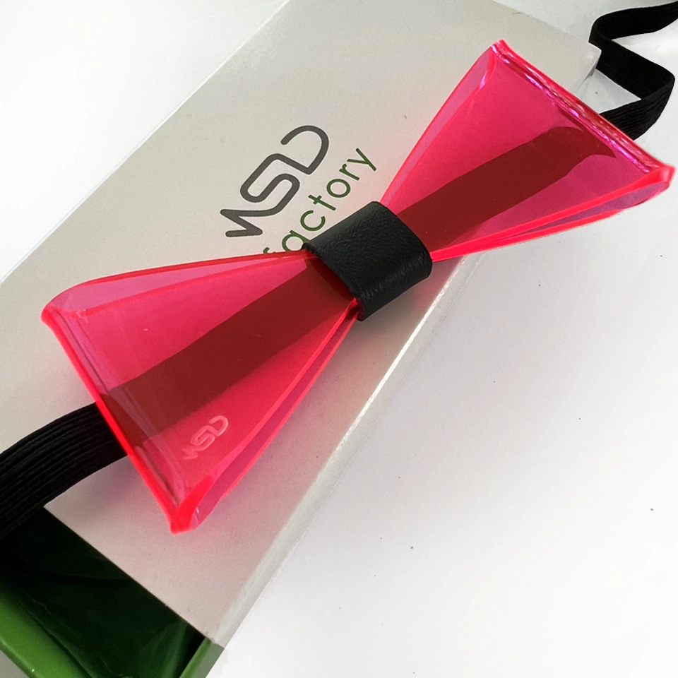 Papillon in plexiglas tagliato al laser e piegato a caldo, tenuto da un elemento in pelle e chiuso con un cinturino elastico regolabile.
