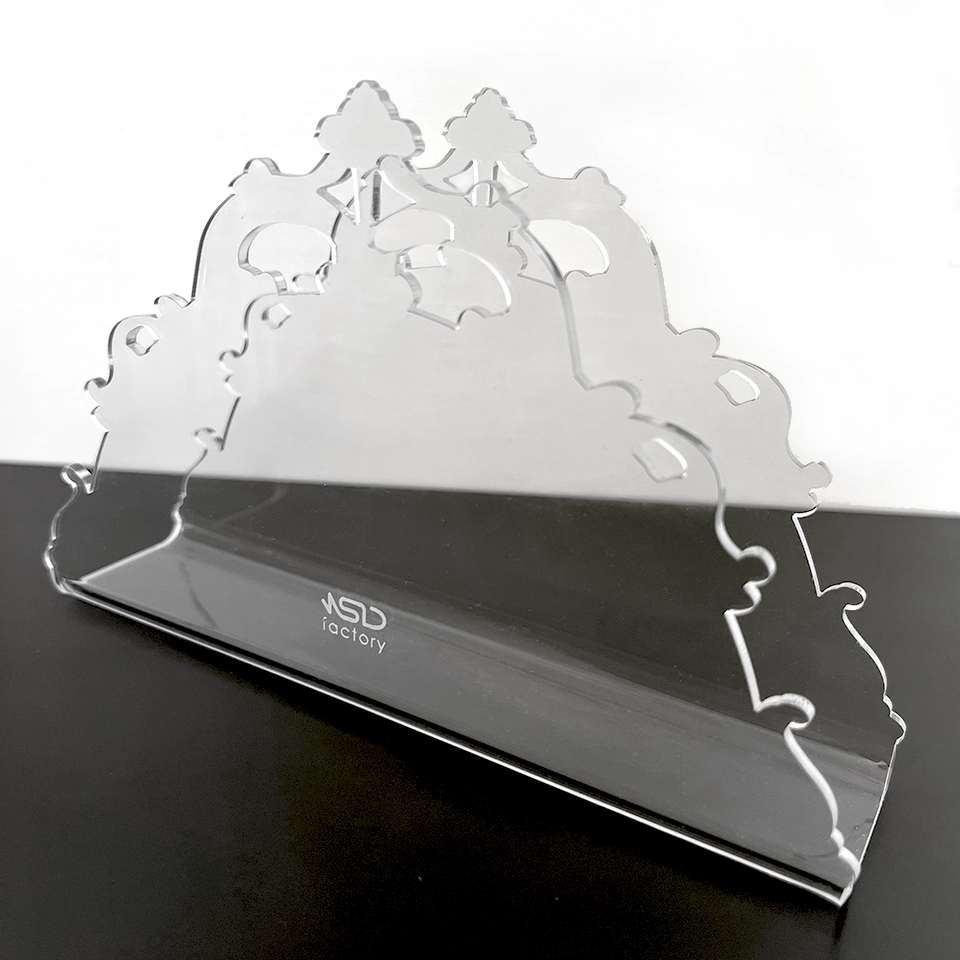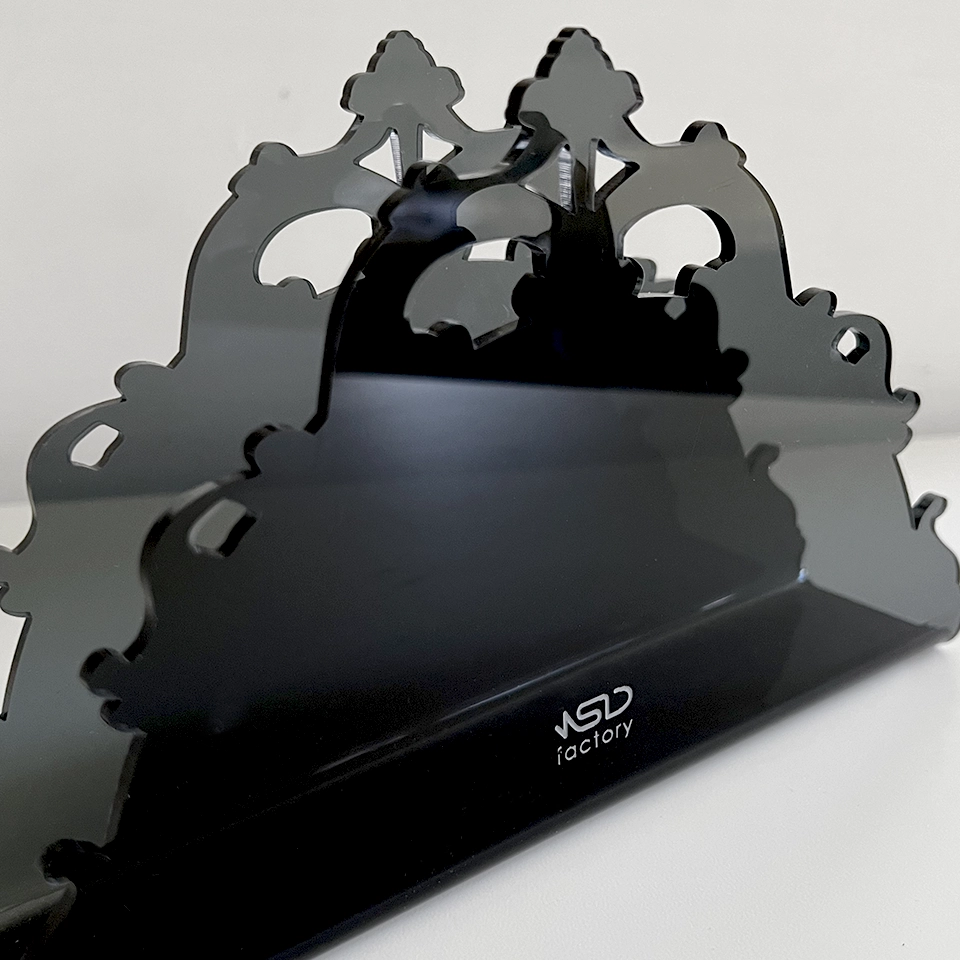 Portatovaglioli realizzato in plexiglass con motivo barocco.
